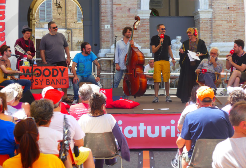 Una piazza Roma preservata dal solleone grazie a degli ombrelloni: il “popolo” del CaterRaduno 2016 – reduce dalla biciclettata notturna “Bikethenight“ può così assistere all’appuntamento mattutino condotto da Solibello e co. e partecipare attivamente alla diretta della trasmissione radiofonica di Radio 2.Sul palco di martedì 5 luglio due conduttori radiofonici: l’ “anziano” Claudio Sabelli Fioretti e lo “youtuber” Claudio di Biagio, i quali dal 1 agosto daranno il via al nuovo programma “Me anziano, you tuber” (dal lunedì al venerdìalle 10,35): in esso i due, provenienti da generazioni e scenari differenti, si scambieranno opinioni e notizie di attualità.