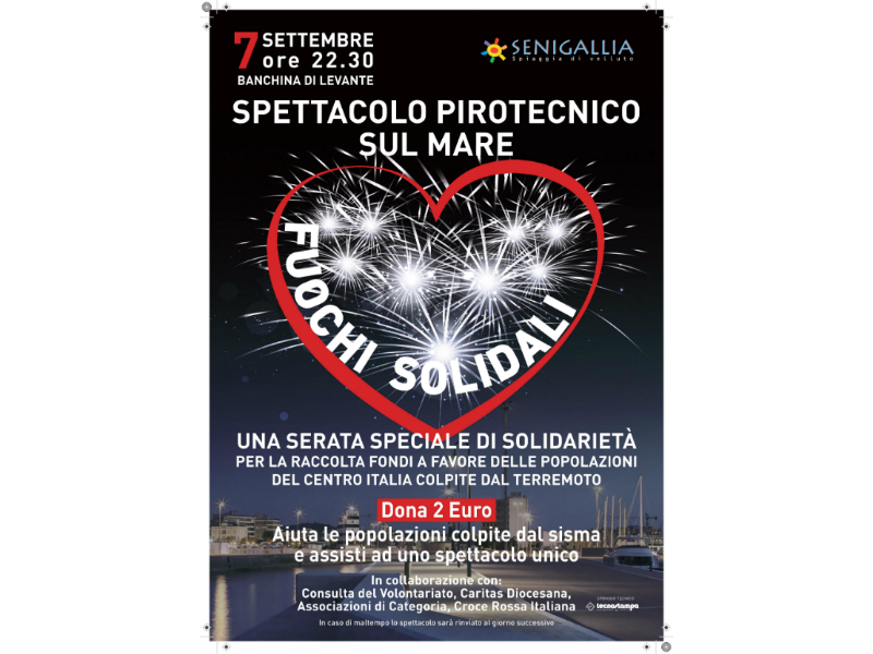 “In questi giorni – afferma il sindaco Maurizio Mangialardi – ho partecipato a molte iniziative promosse da associazioni e imprese commerciali e ho potuto riscontrare che la città si sta mobilitando per dare il proprio contributo a sostegno di chi ha letteralmente perso tutto. Di fronte a tanto dolore e tanta sofferenza, in città è nata una vera e propria gara di solidarietà che, ne sono certo, avrà il suo apice mercoledì con lo spettacolo dei fuochi pirotecnici, cancellato lo scorso 24 agosto in segno di lutto per le vittime del sisma. Auspico che la serata possa coinvolgere anche cittadini provenienti dai territori limitrofi”.