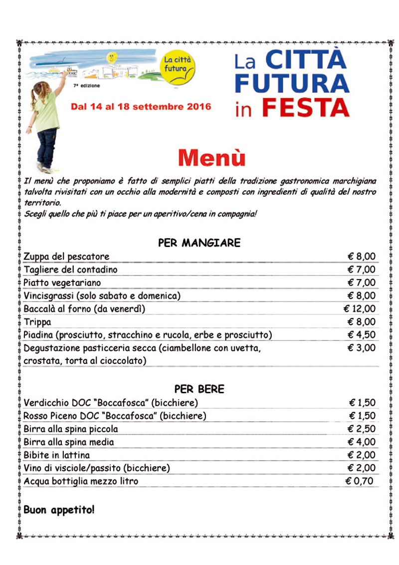 Il menu de La Città Futura in festa 2016