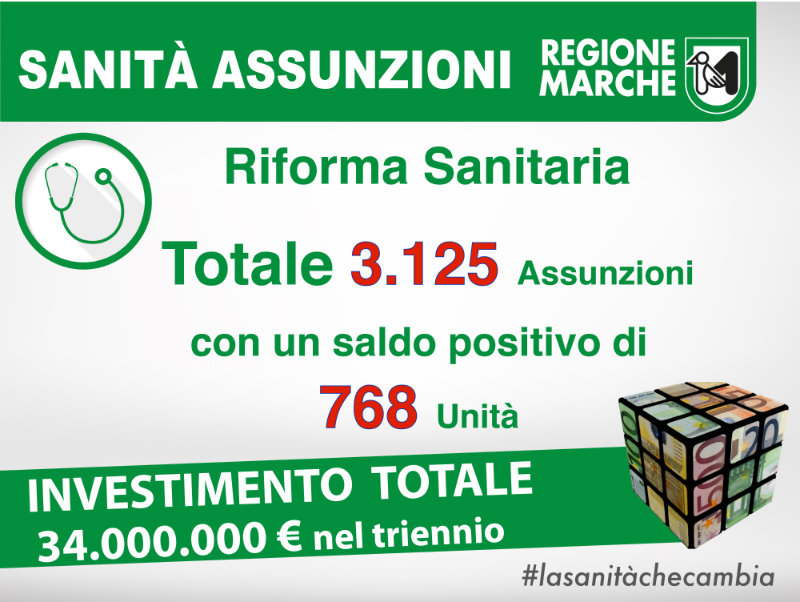 “Giornata importante per le Marche. La giunta regionale ha approvato il piano assunzioni delle aziende ospedaliere e dell’Asur. Tremila unità in più di personale che va a sostituire chi è andato in pensione con un saldo attivo di 768 persone.