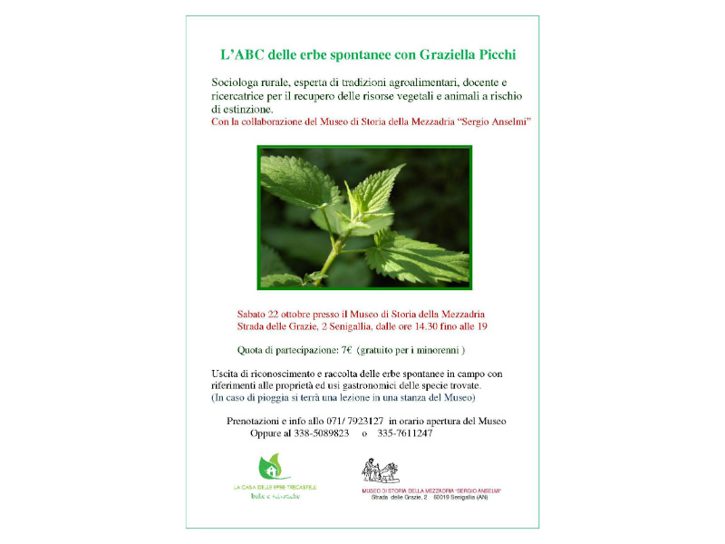 Sabato 22 ottobre, alle 14,30, appuntamento al Museo di Storia della Mezzadria “Sergio Anselmi”per una “lezione sul campo”. Un’uscita di riconoscimento e raccolta delle erbe spontanee con la guida dell’esperta Graziella Picchi che illustrerà caratteristiche nutrizionali, aneddoti e tante curiosità sulle erbe selvatiche commestibili trovate.
