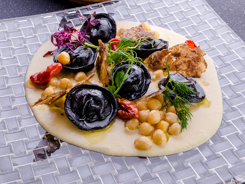 Tortelli di rana pescatrice con crema di ceci e chips di coppa marchigiana