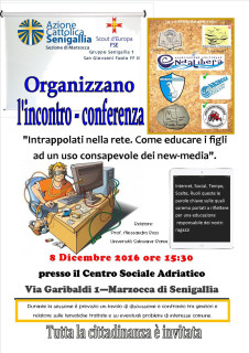 Giovedì 8 dicembre, alle ore 15:30, presso il centro sociale Adriatico di Marzocca, si terrà una conferenza/incontro dal titolo: “Intrappolati nella rete: come educare i figli ad un uso consapevole dei new media”.