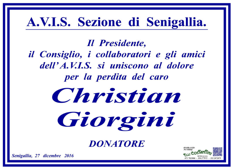 Manifesto di cordoglio della sezione di Senigallia dell'AVIS per la scomparsa di Christian Giorgini