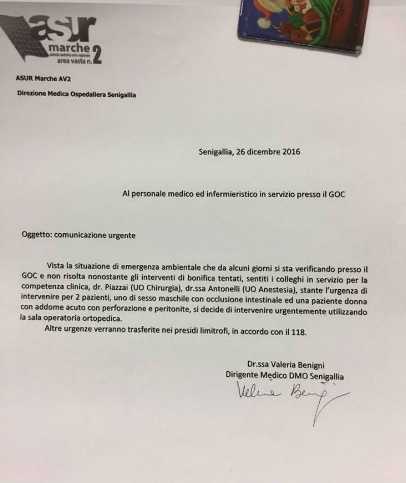 L'avviso sull'emergenza ambientale in sala operatoria nell'ospedale di Senigallia