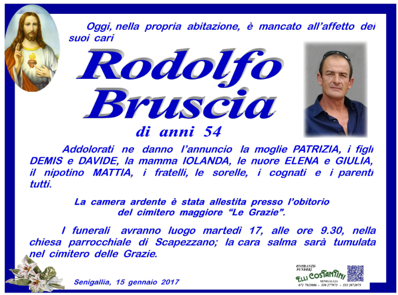Il 15 gennaio, nella propria abitazione, è mancato all’affetto dei suoi cari Rodolfo Bruscia di anni 54.