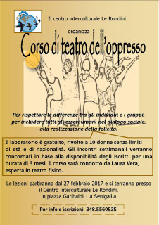 Al Centro Interculturale le Rondini inizia il corso di Teatro dell’Oppresso, le iscrizioni entro il 27 febbraio. Questa nuova esperienza avrà come protagoniste 10 donne di ogni età e nazionalità che saranno guidate da Laura Vera, esperta di teatro fisico, proveniente dalla Real Escuela Superior de Arte Dramático (www.resad.es) in Spagna e qui in Italia per un progetto Erasmus.