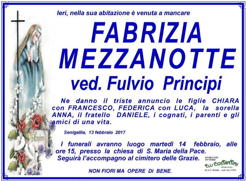 Il 12 febbraio, nella sua abitazione è venuta a mancare Fabrizia Mezzanotte ved. Fulvio Principi. Ne danno il triste annuncio le figlie Chiara con Francesco, Federica con Luca, la sorella Anna, il fratello Daniele, i cognati, i parenti e gli amici di una vita.