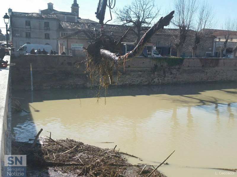 Lavori di pulizia del letto del fiume Misa a Senigallia, sotto i piloni del ponte Garibaldi