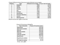 La concentrazione maggiore di case vuote nelle Marche, dove sono quasi 176 mila le abitazioni non occupate (22,29% del totale), è nelle province di Ascoli Piceno (1° posto regionale con il 25,34% e 27.851 immobili vuoti), Fermo (2° con il 24,81% e 22.274 immobili) e Macerata (3° con 23,96% e 39.276 immobili). Sotto la media regionale il tasso di case non occupate in provincia di Pesaro-Urbino (21,52% e 40.126 immobili vuoti) e Ancona (19,39% e oltre 46 mila immobili).