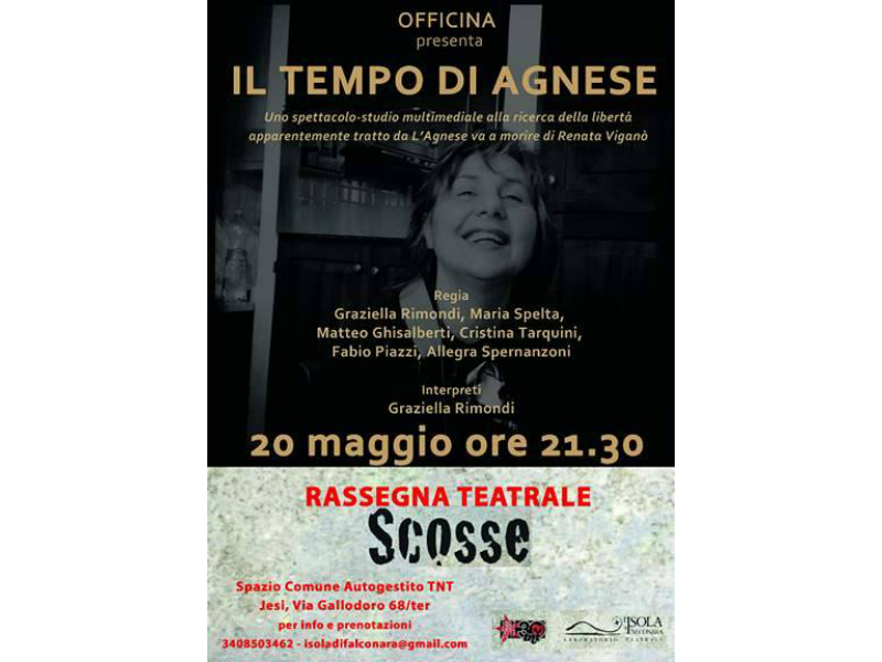 L’Associazione teatrale “L’Isola di Falconara” ha il piacere di presentare l’ultimo spettacolo della sua prima stagione teatrale: “SCOSSE”: “Il Tempo di Agnese” prodotto dal Gruppo di Sperimentazione Teatrale “Officina” di Piacenza. Il tempo di Agnese (ispirato a L’Agnese Va a Moriredi Renata Viganò) è uno spettacolo-studio multimediale che pone gli spettatori domande sulla ricerca della libertà.