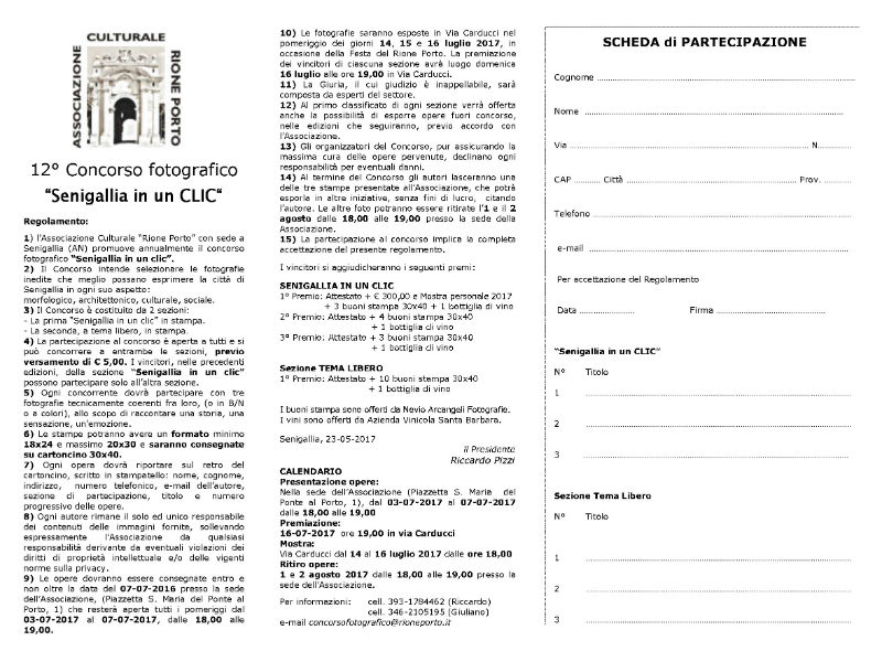 L’Associazione Culturale Rione Porto ha pubblicato sul proprio sito il Regolamento (foto in evidenza) del 12° Concorso fotografico “Senigallia in un clic” che si terrà nell’ambito della tradizionale Festa del Porto programmata, d’intesa con l’Amministrazione Comunale, in via Carducci per i giorni 14 – 16 luglio p.v.
