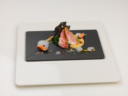 Triglie scottate all’olio extra vergine di oliva, crema di ceci e cime di rape con aria e mosciolo di Portonovo e cialda al nero