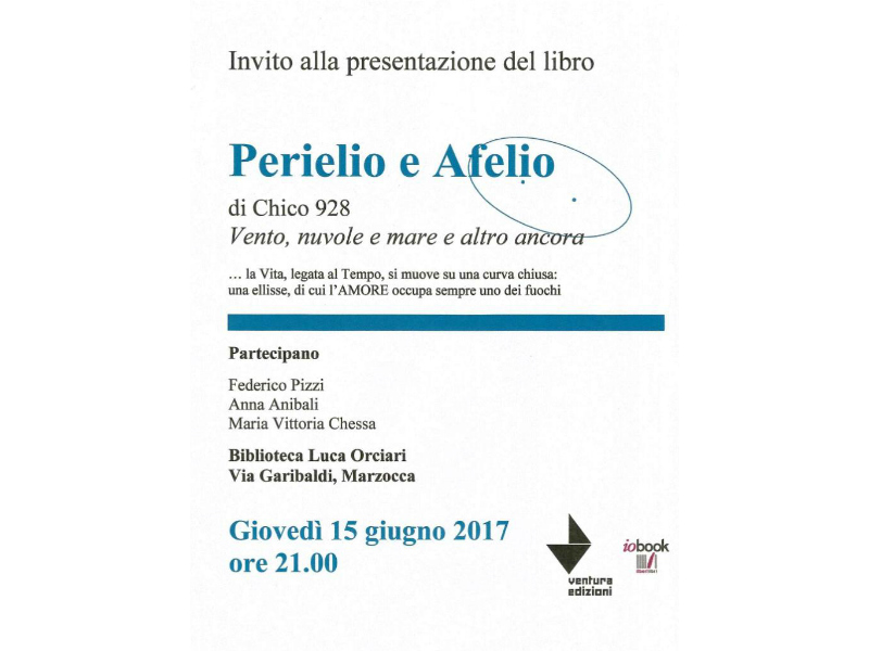 Si terrà a Marzocca la presentazione del libro “Perelio e Afelio” di Chicco 928. L’appuntamento è per giovedì 15 giugno 2017 alle ore 21.00 nei locali della Biblioteca Comunale “Luca Orciari” .
