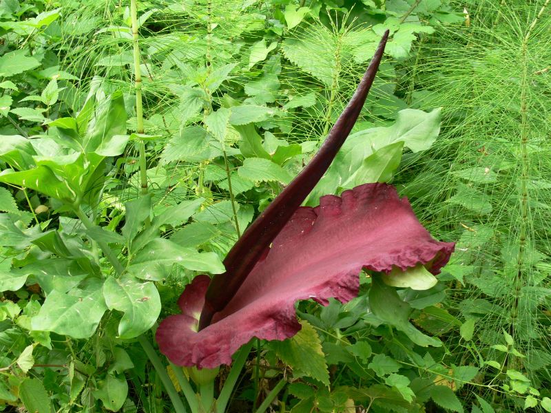 Oltre alla bellezza della grossa infiorescenza formata da una brattea ondulata e da una lunga spata (vedi foto) che purtroppo dura pochissimo, circa tre giorni, questa curiosa pianta emana un forte e poco gradevole fetore di carne marcia, necessario per attirare insetti come mosche e moscerini indispensabili all’impollinazione dei piccoli fiori maschili e femminili che sono alla base della spata.