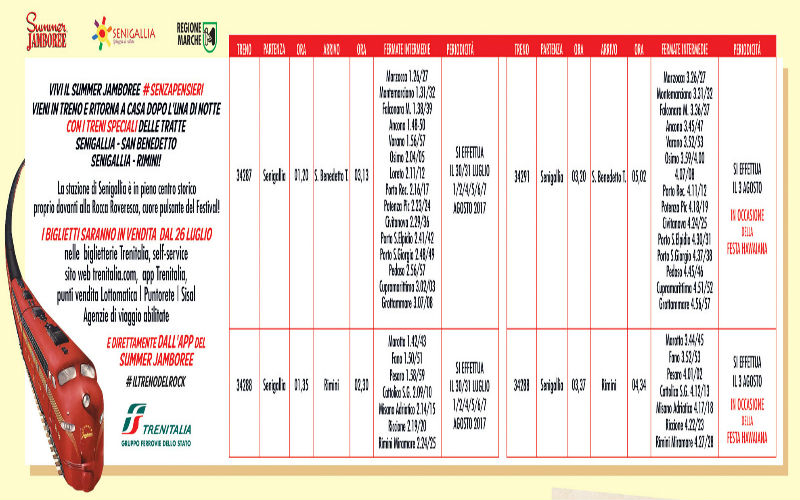 Treni speciali per i fan del “Summer Jamboree” 2017! Per garantire che tutti si godano al meglio le atmosfere gioiose e spensierate della “hottest rockin’ holiday on Earth”, divertendosi in tranquillità e sicurezza, durante il periodo del Festival saranno predisposti alcuni treni straordinari in partenza dalla stazione di Senigallia e diretti sia lungo la tratta sud fino a San Benedetto, sia lungo la tratta nord fino a Rimini, con tante fermate intermedie.