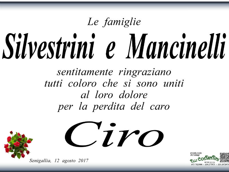 Le famiglie Silvestrini e Mancinelli ringraziano sentitamente tutti coloro che si sono uniti al loro dolore per la perdita del caro Ciro.