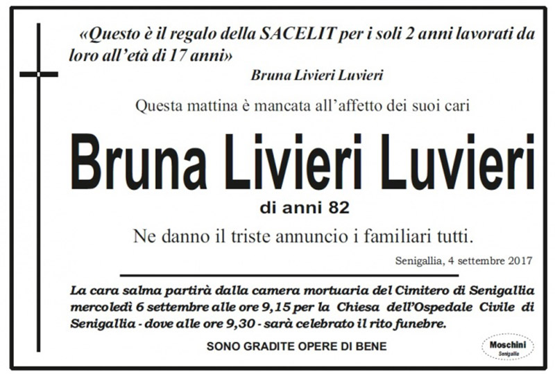 “Questo è il regalo della Sacelit per i soli due anni lavorati da loro all’età di 17 anni” è la frase firmata da Bruna Livieri Luvieri, la pensionata di Senigallia morta lunedì 4 settembre all’ospedale civile cittadino.