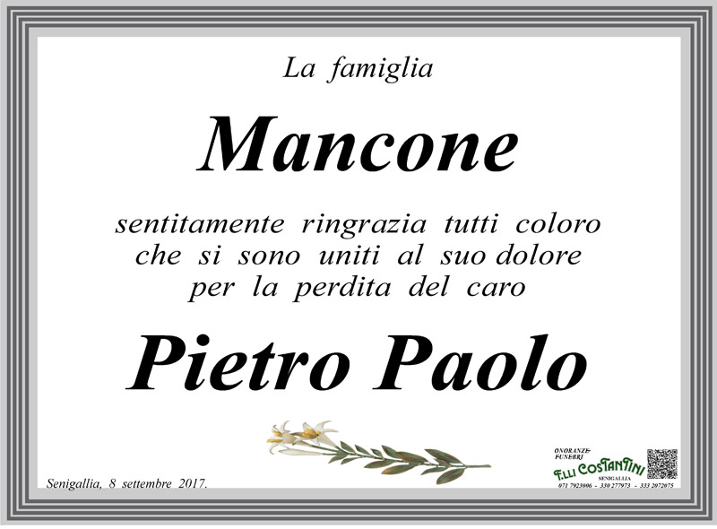 La famiglia Mancone sentitamente ringrazia tutti coloro che si sono uniti al suo dolore per la perdita del caro Pietro Paolo.