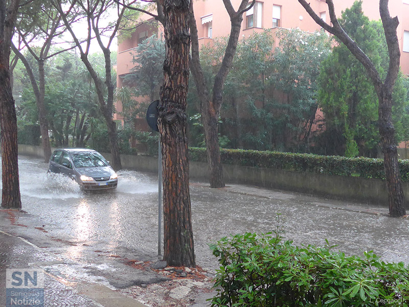 Strade che sono diventate ruscelli nel giro di poche decine di minuti a Senigallia: un’abbondantissima pioggia che si è riversata sulla zona a fine mattinata di lunedì 11 settembre ci ha messo davvero poco per inondare diverse carreggiate.