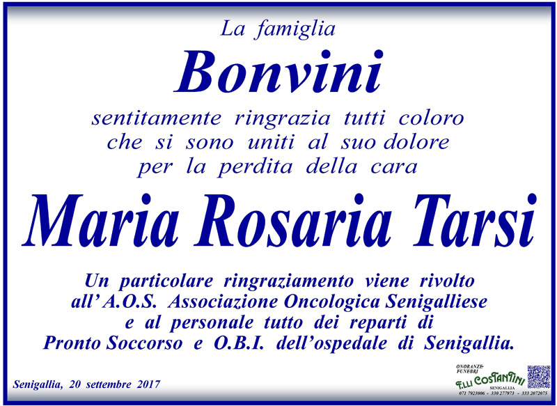 La famiglia Bonvini sentitamente ringrazia tutti coloro che si sono uniti al suo dolore per la perdita della cara Maria Rosaria Tarsi.