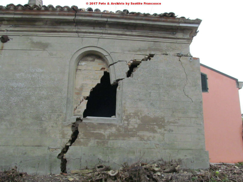 Come dimostrano le foto di Francesco Sestito, che ringraziamo, il luogo di culto, chiuso ormai da tanti anni, continua miracolosamente a rimanere in piedi nonostante un ampio squarcio sulla parete laterale.