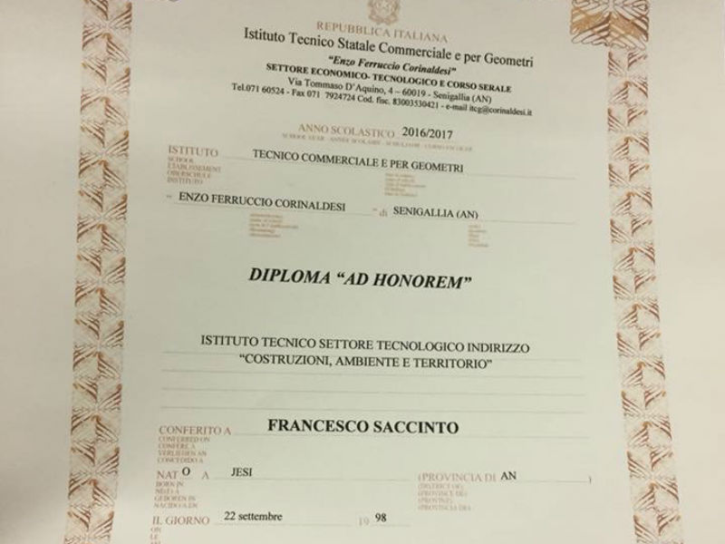 Senigallia: consegnati diplomi Corinaldesi 2017, che emozione quello per “Saccio”