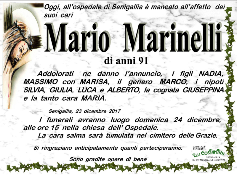 Oggi, all’ospedale di Senigallia è mancato all’affetto dei suoi cari Mario Marinelli di anni 91.