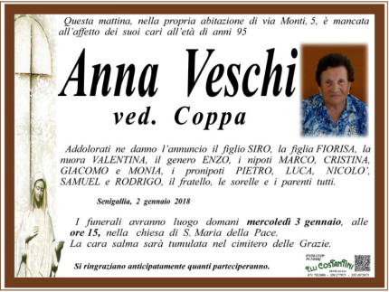 Nella mattinata di martedì 2 gennaio, nella sua abitazione di via Monti 5 a Senigallia, è mancata all’affetto dei suoi cari Anna Veschi, vedova Coppa.