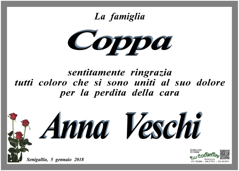 La famiglia Coppa sentitamente ringrazia tutti coloro che si sono uniti al suo dolore per la perdita della cara Anna Veschi.