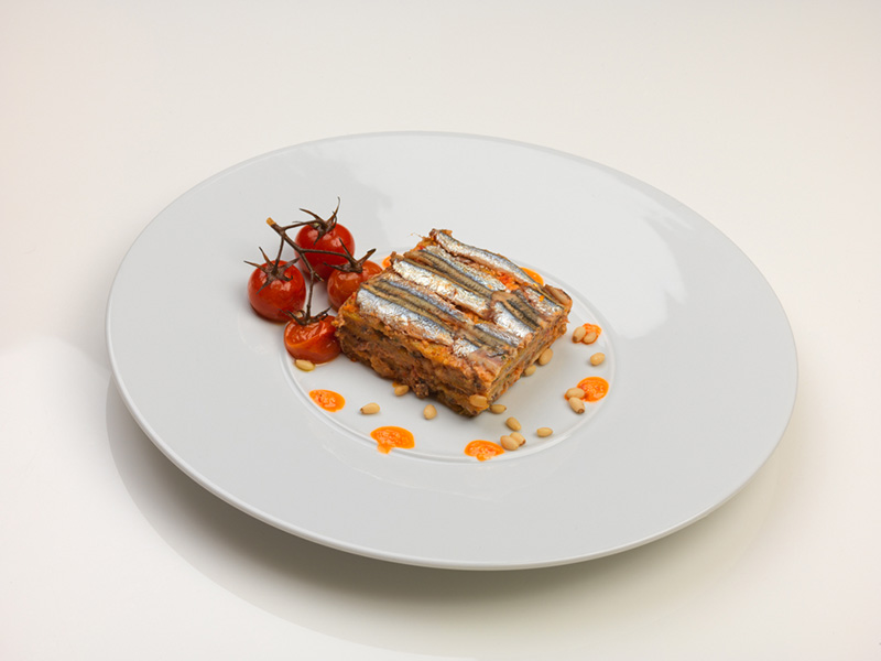Millefoglie di sardoncini e rostì di patate con pesto di pomodoro