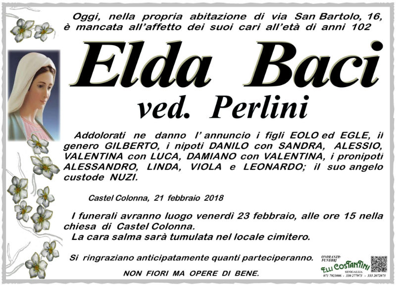 Il 21 febbraio, nella sua abitazione di via San Bartolo a Castel Colonna (Trecastelli) è mancata all’affetto dei suoi cari Elda Baci, vedova Perlini, di anni 102.