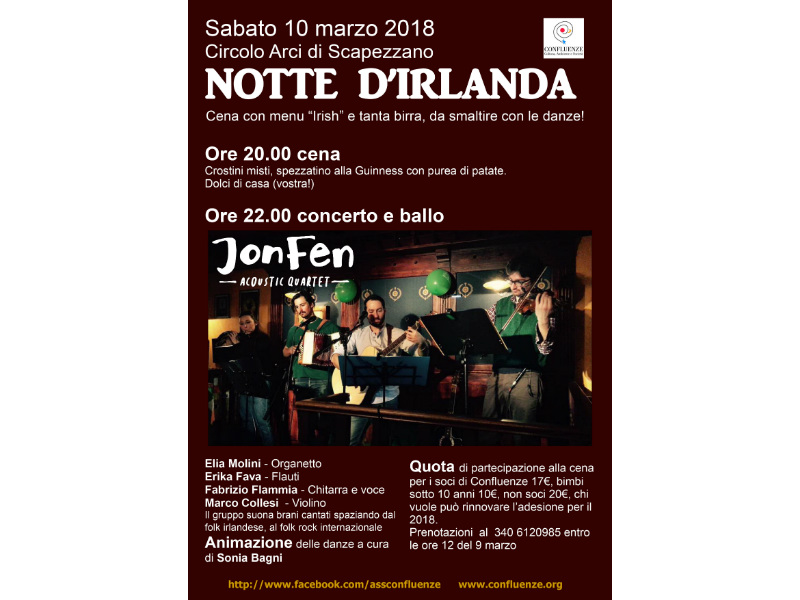Questo il programma: alle ore 20.00 cena con menu di crostini misti, spezzatino alla guinnes con purea di patate e dolci offerti dai partecipanti. Alle ore 22.00 concerto e ballo con il quartetto acustico dei JONFEN.