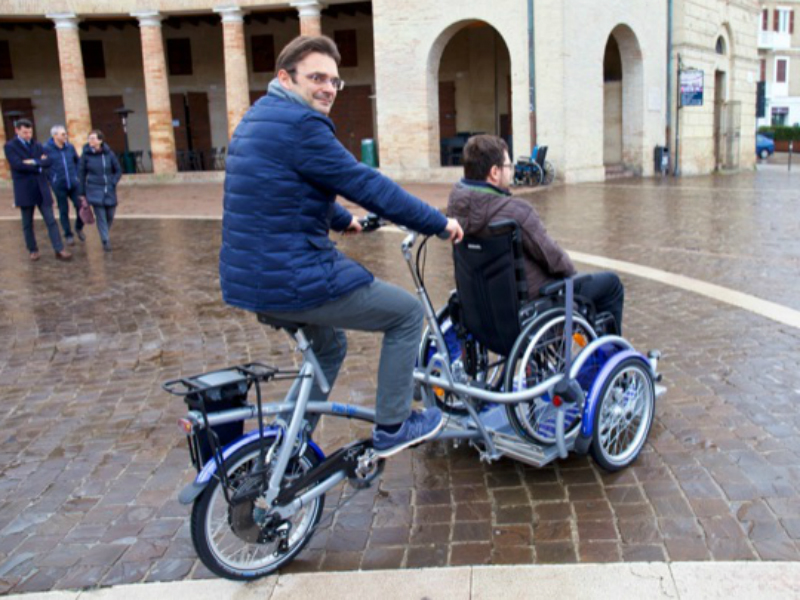 All’inizio del 2016 in Italia è arrivata Aspasso, a Senigallia. La bicicletta è speciale perchéè leggera e semplice da usare: in pochi secondi la carrozzina è agganciata in totale sicurezza e, grazie all’innovativo sistema di pedalata assistita e di retromarcia, tutti possono guidarla senza sforzo, dato che la bicicletta è elettrica, e condurre il disabile a destinazione. Protec Ambiente, l’azienda che distribuisce il mezzo in Italia e che promuove questo progetto di mobilità urbana sostenibile e solidale, ha donato la prima bicicletta alla cooperativa sociale Casa della Gioventù onlus con la consegna nel febbraio del 2016 durante un evento pubblico patrocinato dal Comune di Senigallia.