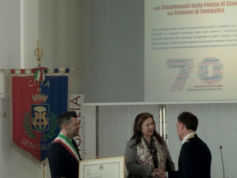 A ricevere l’attestato dal sindaco Maurizio Mangialardi è stata Cinzia Guercio, Prefetto e Direttore Centrale del Dipartimento della Pubblica Sicurezza, che ha portato anche i saluti del capo della Polizia, Prefetto Franco Gabrielli, annunciato ma all’ultimo momento bloccato da impegni lavorativi.