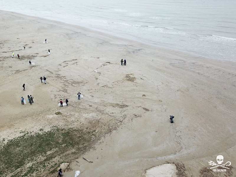 Volontari di Sea Shepherd impegnati nella pulizia della spiaggia libera a Senigallia