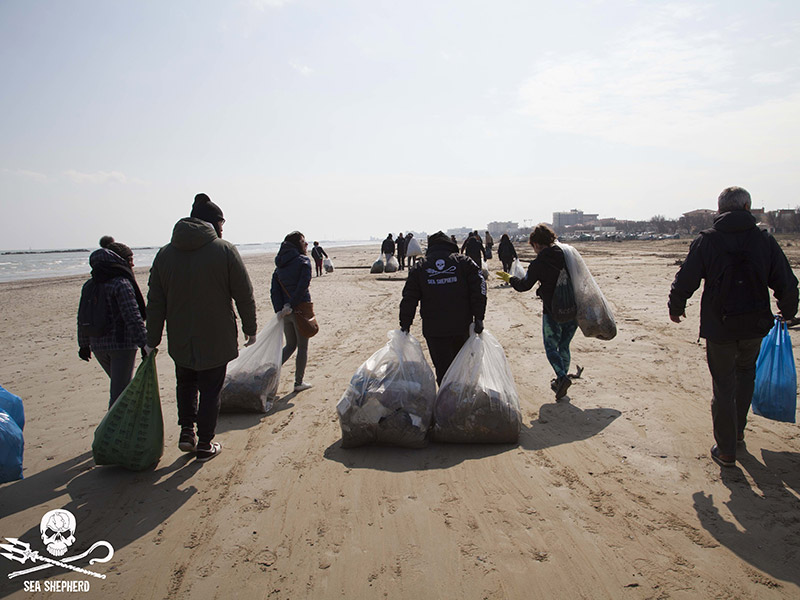 Volontari di Sea Shepherd impegnati nella pulizia della spiaggia libera a Senigallia