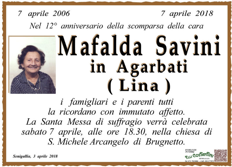 Nel 12° anniversario della scomparsa della cara Mafalda Savini in Agarbati (Lina) i famigliari e i parenti tutti la ricordano con immutato affetto.