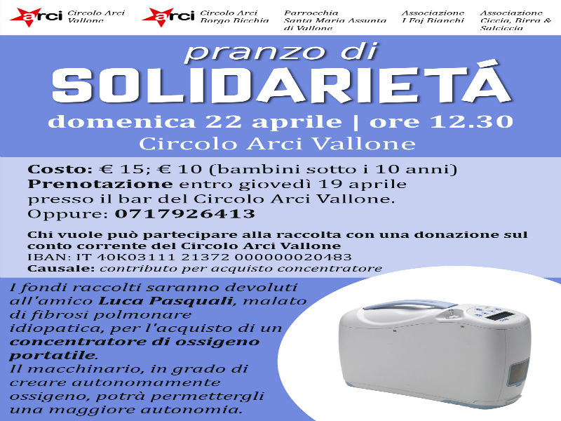 Il pranzo, organizzato in collaborazione con il circolo Arci Borgo Bicchia, la Parrocchia Santa Maria Assunta di Vallone, l’Associazione “I Foj Bianchi” e l’Associazione “Ciccia, Birra & Salciccia”, avrà il nobile fine di raccogliere fondi a favore del concittadino ed amico Luca Pasquali, malato di fibrosi polmonare idiopatica, e saranno utilizzati per l’acquisto di un concentratore di ossigeno portatile.