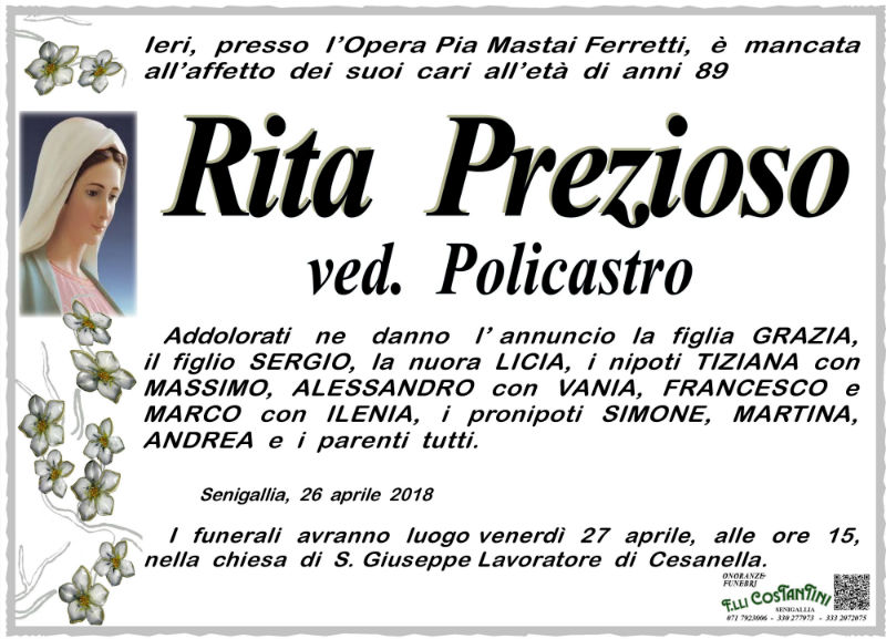 Ieri, mercoledì 25 aprile, presso l’Opera Pia Mastai Ferretti, è mancata all’affetto dei suoi cari all’età di anni 89, Rita Prezioso, vedova Policastro.