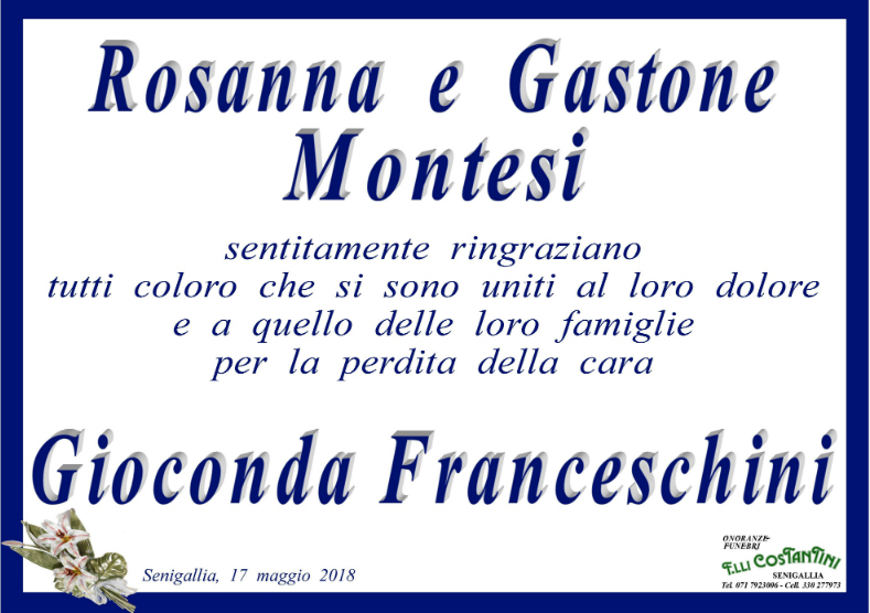 Rosanna e Gastone Montesi sentitamente ringraziano tutti coloro che si sono uniti al loro dolore e a quello delle loro famiglie per la perdita della cara Gioconda Franceschini.