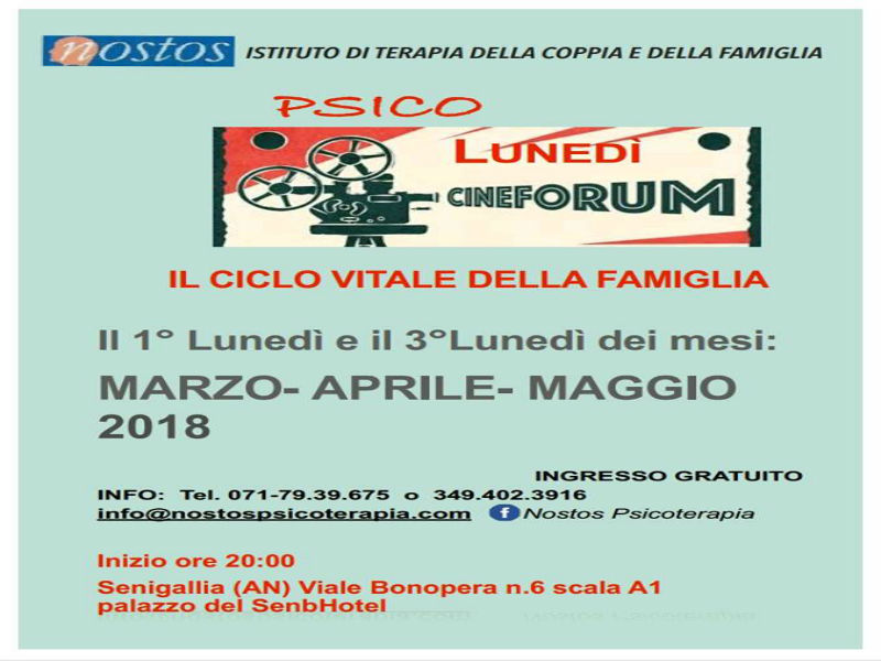 Lunedì 21 maggio, alle h 20,30, si concluderà l’attività di Psicocineforum, organizzata da Nostos, Centro di Psicoterapia della coppia e della famiglia.