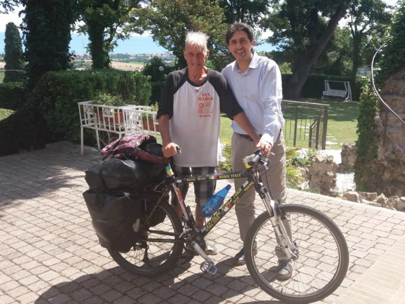 Ha fatto tappa anche a Senigallia Janus River, l’80enne che gira il mondo in bicicletta. Il ciclista si è fatto immortalare all’Hotel Bel Sit con il responsabile Marco Manfredi.