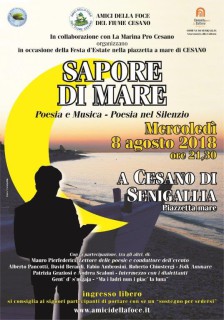 Sapore di mare, con il patrocinio del Comune di Senigallia, avrà luogo nella piazzetta di Cesano di fronte al mare, Mercoledì 8 agosto 2018 alle ore 21,15 con un programma simile agli anni scorsi (poesia sull’ambiente, sull’attualità, sui sentimenti, ecc.), ma più ricco nell’animazione e nella commedia teatrale.