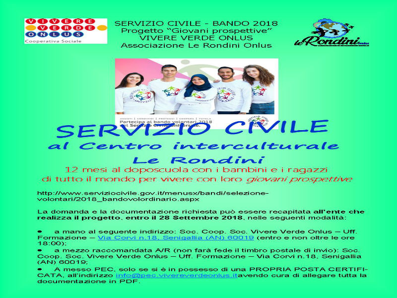 Il progetto presentato dall’ente proponente Cooperativa sociale Vivere Verde Onlus dal titolo “Giovani prospettive”, sarà realizzato all’interno del centro interculturale le Rondini a Senigallia.