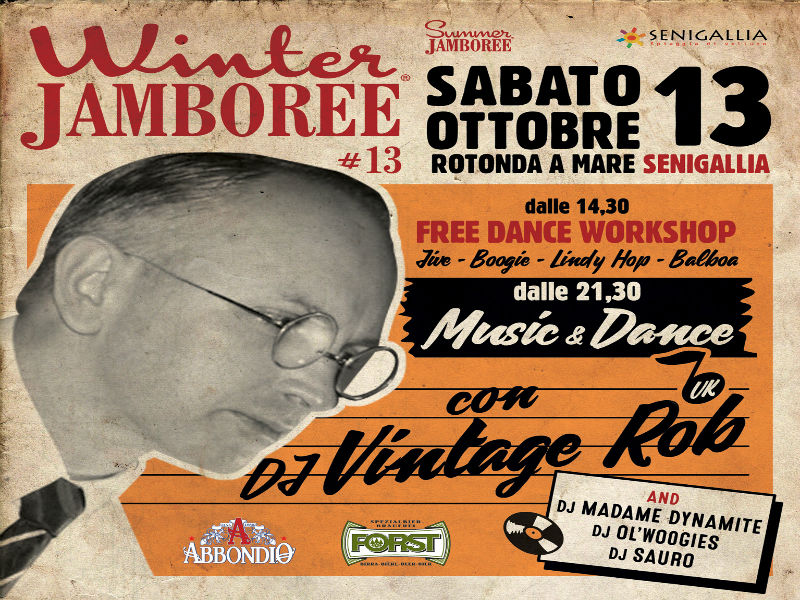 Il primo evento serale di balli swing del Winter Jamboree #13 si aprirà con il Record Hop del DJ Vintage Rob, al secolo Robert Hornsby, che da oltre 25 anni riempie le piste da ballo in stile nel Regno Unito con ricercate proposte musicali che spaziano dagli anni ’30 agli anni ’50. La popolarità e la reputazione di Rob lo mettono sempre in testa alla lista dei migliori DJ Inglesi. Il suo è un mix ben ponderato dei migliori standard di tutti i tempi assieme a “riempipista” meno conosciuti, tutti irresistibilmente ballabili! Con Vintage Rob ci saranno a fare gli onori di casa anche i DJ Sauro, Madame Dynamite, e come sempre Graffiti Ol’Woogies ovvero Angelo Di Liberto Direttore Artistico del Summer Jamboree.