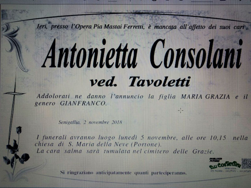 Il 1° novembre, presso l’Opera Pia Mastai Ferretti, è mancata all’affetto dei suoi cari, Antonietta Consolani, vedova Tavoletti.