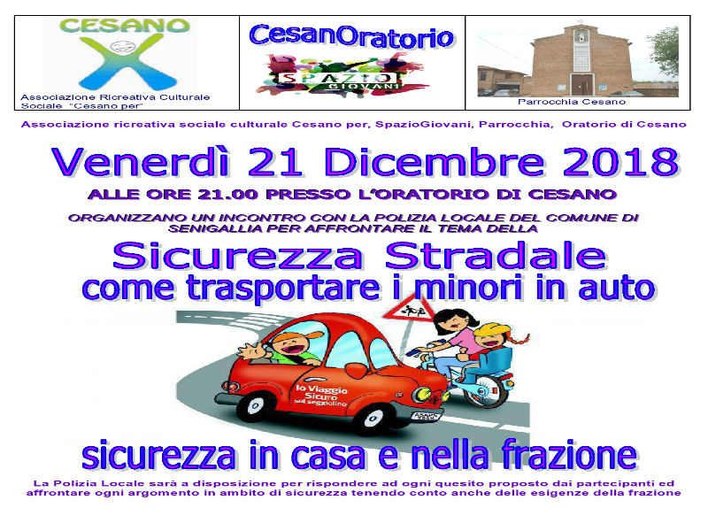L’associazione ricreativa culturale sociale “Cesano per”, CesanOratorio e la Parrocchia di Cesano, organizzano un incontro sulla sicurezza stradale e sul trasporto dei minori in auto.