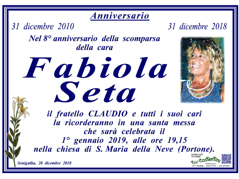 Una Santa messa per ricordare Fabiola SetaSi terrà il 1°gennaio nella Chiesa di S. Maria della Neve1.766 Letture0 commentiCronacaAscolta la notizia Nel 8° anniversario della scomparsa della cara Fabiola Seta il fratello Claudio e tutti i suoi cari la ricorderanno in una Santa messaContinua a leggere e commenta su Senigallia.org