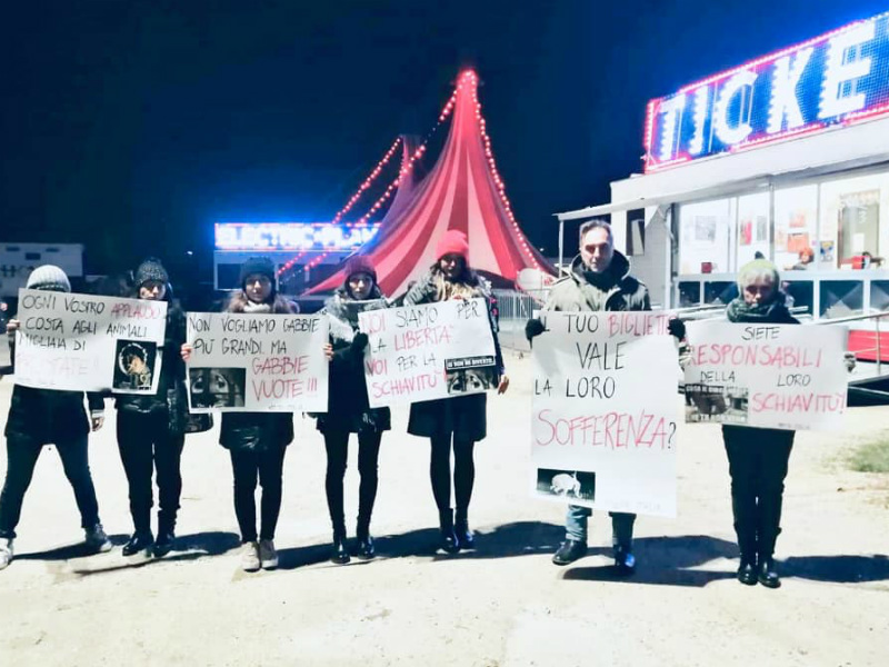 “Siamo degli attivisti di M.E.T.A. ITALIA e come tali, siamo la voce di tutti gli esseri senzienti sfruttati, maltrattati, resi schiavi dall’uomo e reclusi in gabbia -spiegano i manifestanti- Per gli animali il circo significa prigionia a vita in luoghi angusti, continui spostamenti sui camion, sofferenza psicologica e fisica per le percosse subite negli addestramenti.